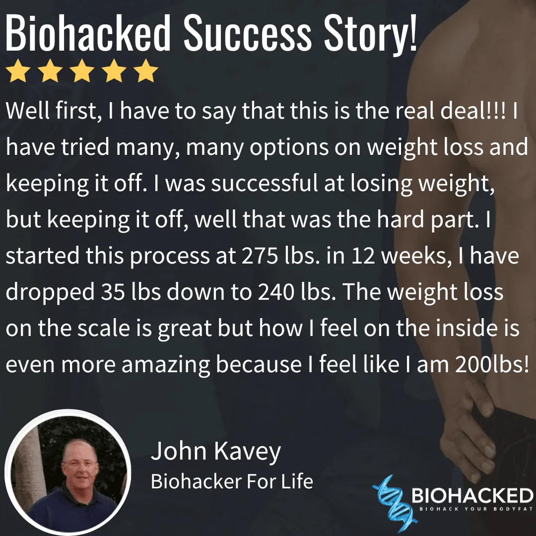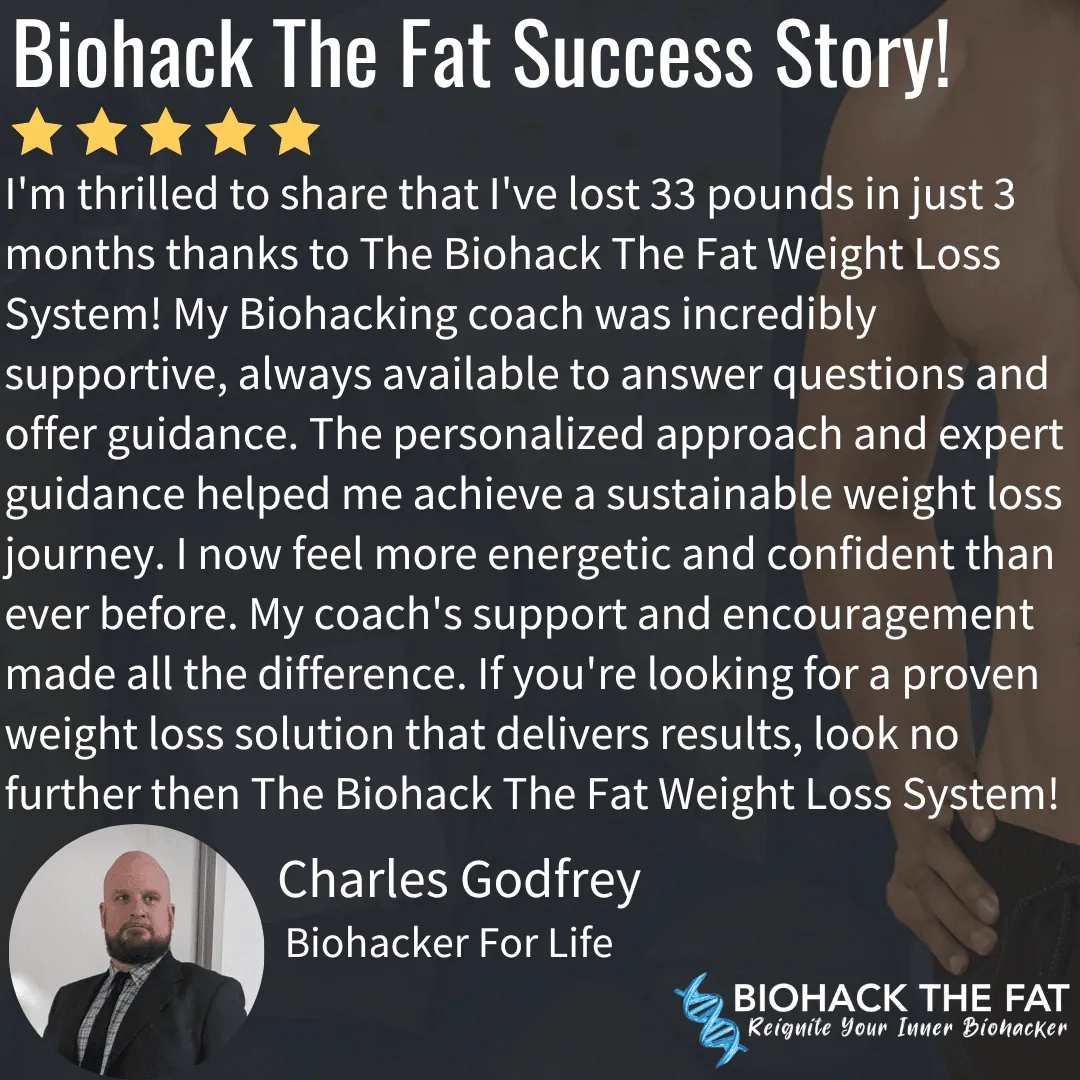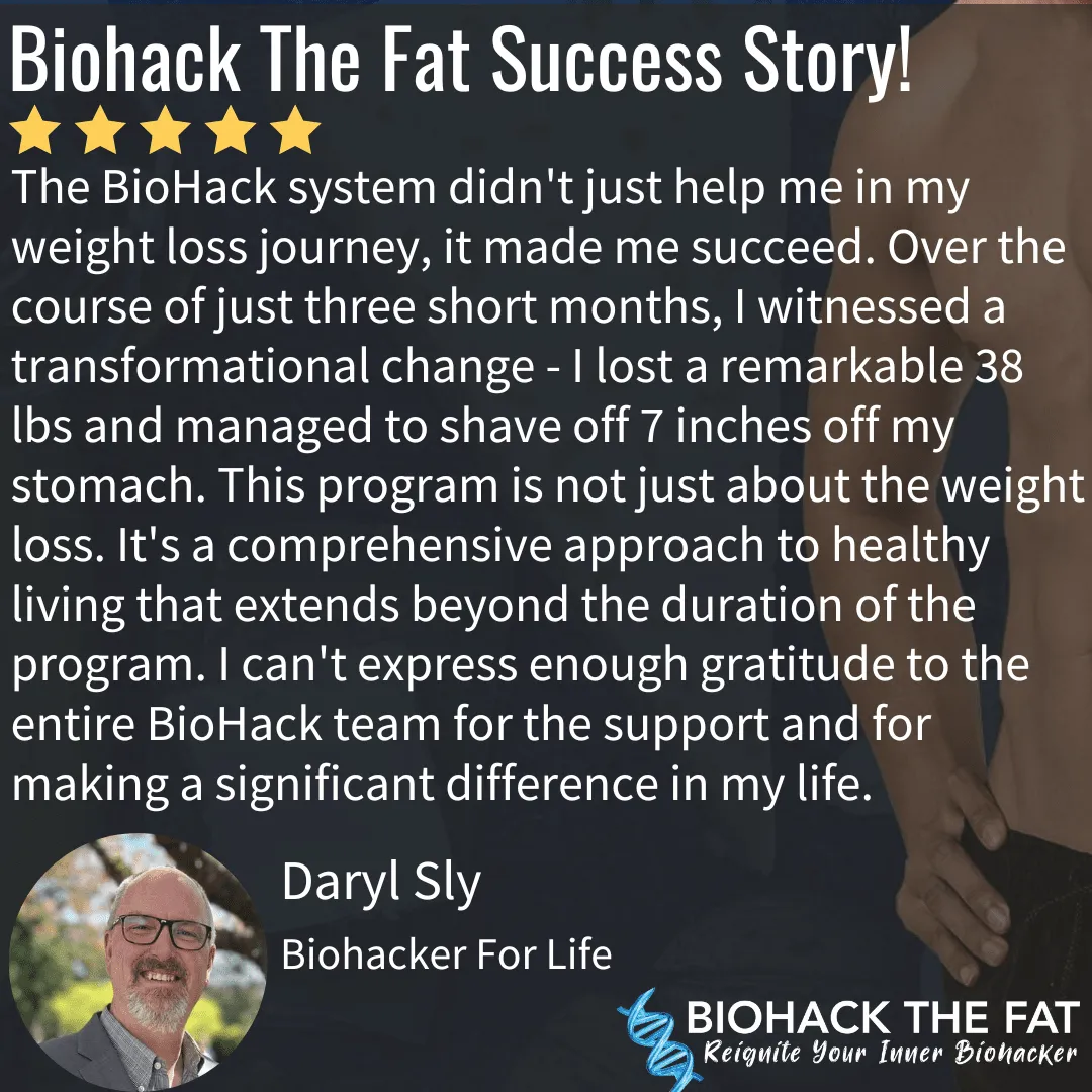 Daryl's transformation is nothing short of amazing! In just 3 months with the Biohack The Fat Weight Loss System, he dropped 30 lbs, lost 15 inches, and reduced his body fat by nearly 6%. But the results didn’t stop there—his eczema improved, allergies lessened, and he started sleeping better than ever before!
